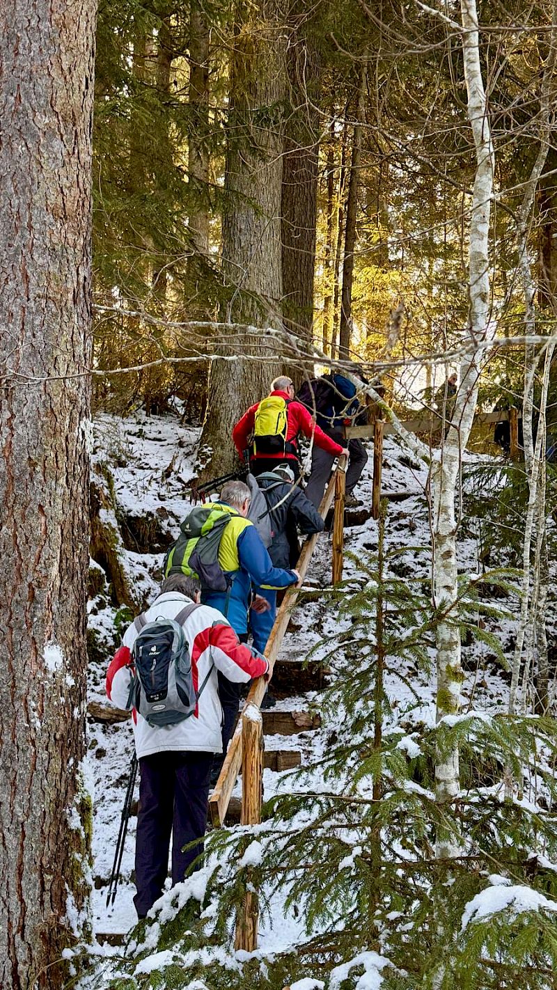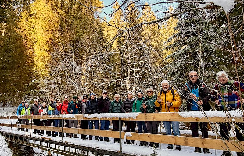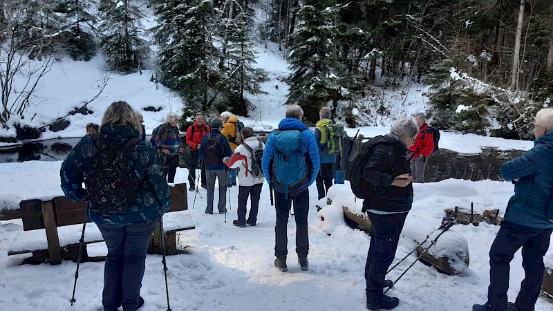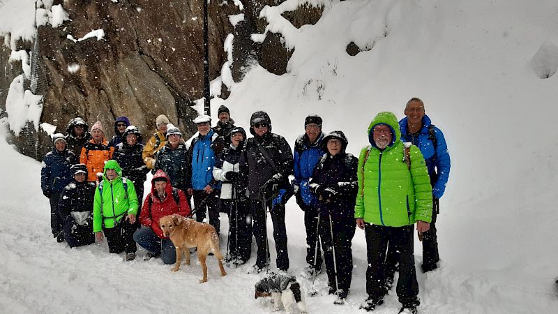 Der frischverschneite Weg führte uns in den Seeligraben. Der etwas steile Abstieg zur dortigen zur Höhle, welche offenbar keinen Namen hat, aber imposant und ein wenig an die Orridi im OSSOLA erinnert. Nach ca. 1 ½ Stunden erreichten wir St. Antoni wo für uns im Restaurant Senselerhof ein gutes Essen auf uns wartete. Die Wanderung führte uns dann weiter durch die verschneite Landschaft nach Menzihus und Niedermuhren nach Oberledeu. Einige Teilnehmer kennen diesen Wegabschnitt von einer früheren Wanderung durch den Zirkelsgraben.