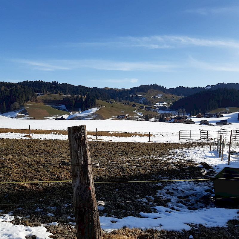 Ferne und der tolle Berneralpenkranz umrahmten den Blickwinkel. Ebenso in südwestlicher Richtung das Dorf Signau und die Moosegg. Ab Bagenschwand öffnete sich die Sicht nun ins untere Emmental, Lauperswil, Zollbrück, Ranflüh, Rüderswil und in der Ferne die Jurakette. Ab den Bauernhöfen Bagenschwand begann bei Hof Riebelberg der Abstieg nach Neumühle.