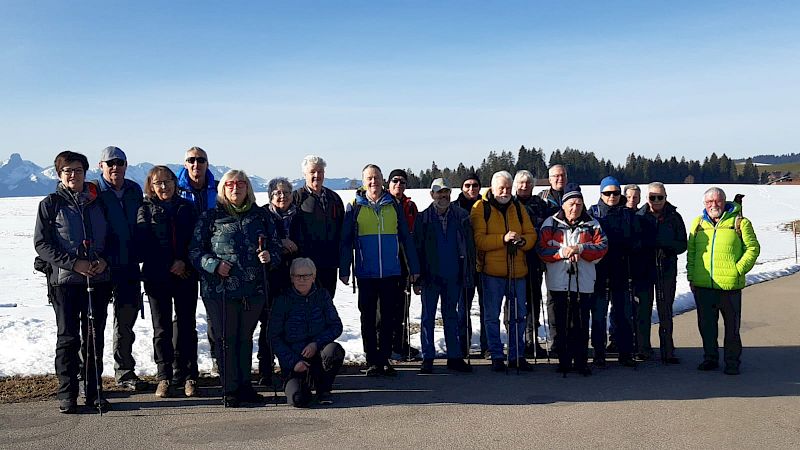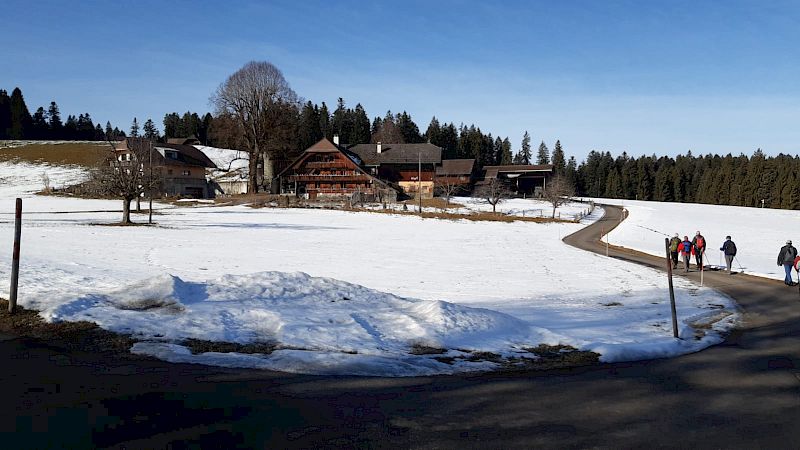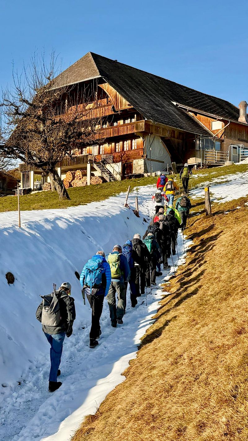 Unsere Novemberwanderung fiel genau auf den Tag mit dem ersten Schneefall, von bis zu 30 cm Neuschnee. Der Schnee war für uns kein Problem. Schwierigkeiten bereitete uns mehr der ÖV mit Ausfällen und grossen Verspätungen. Für ein paar Teilnehmer endete die Reise bereits im Münsingen, wo es kein Weiterkommen nach Bern gab. Für die restlichen 11 Teilnehmer begann die «Winterwanderung» mit 1 Stunde Verspätung in Alterswil FR.