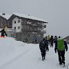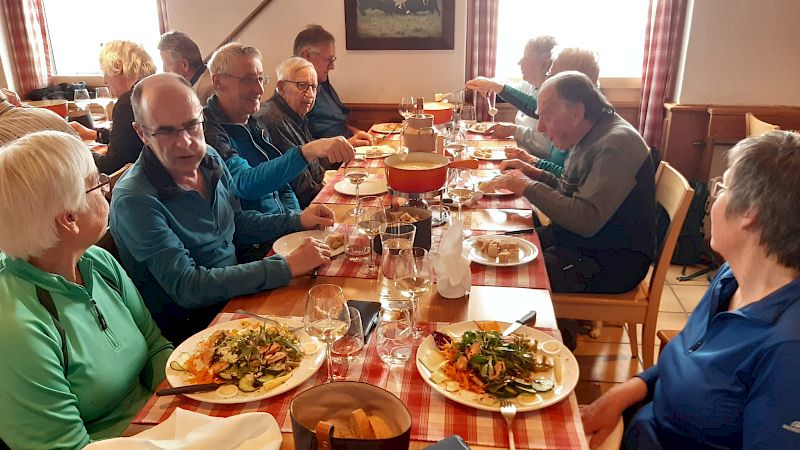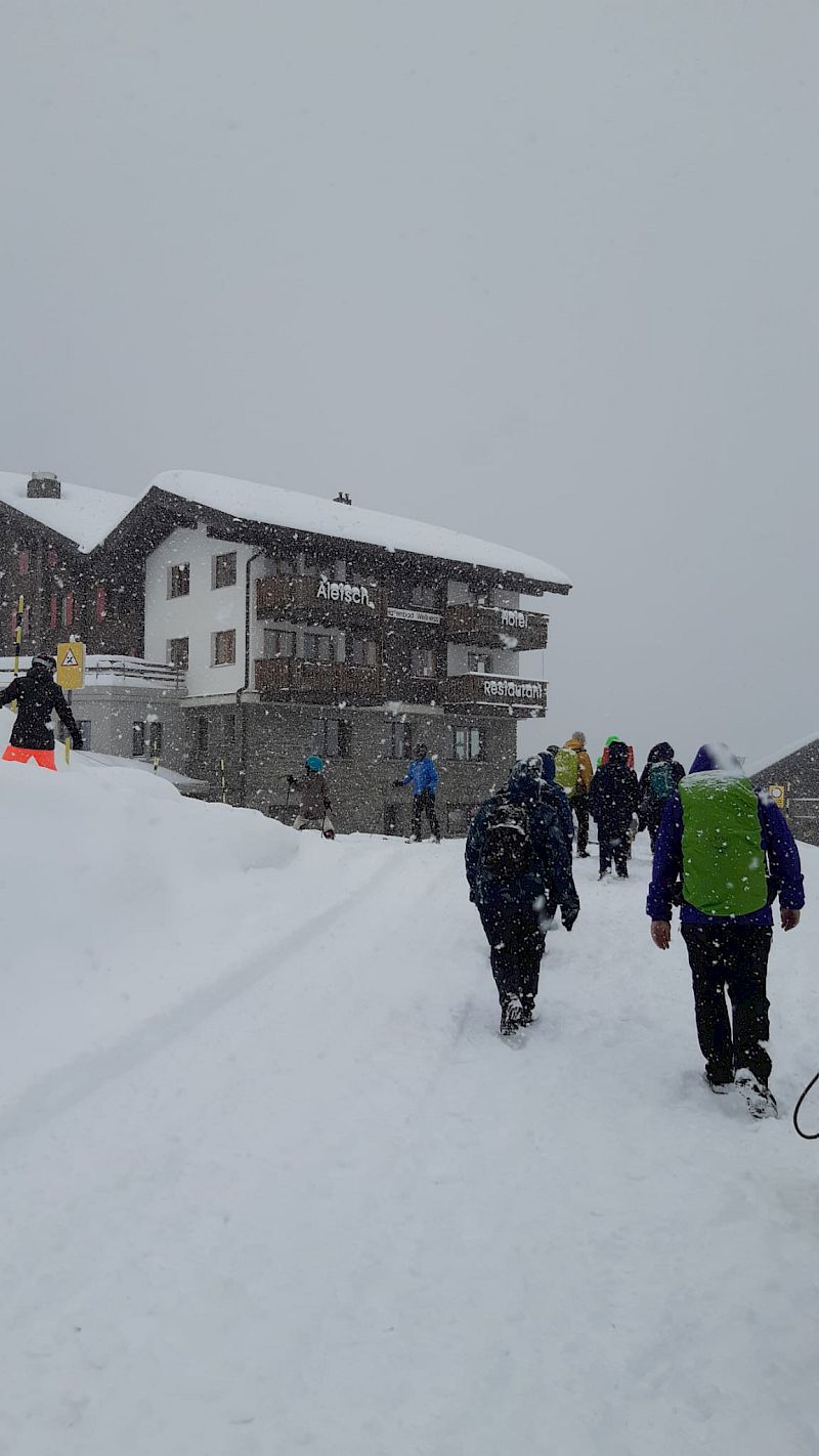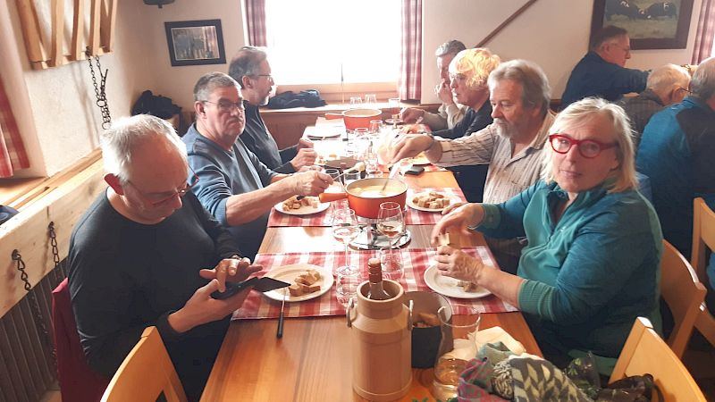 Da die Wetterprognosen für den 11. Februar am Morgen auf der Fiescheralp Schneefall vorgesehen hat und der Weg bis auf die Bettmeralp bei schlechter Sicht nicht ganz ohne ist, hat Koni in Absprache mit Jürg beschlossen diesen Abschnitt zu unterlassen und direkt auf die Bettmeralp zu reisen. Mit dem IC6 ab Bern 1 ½ Stunden später trafen sich 15 wetterfeste Teilnehmer. Ab Brig mit der MGB bis nach Betten und mit der Bergbahn Aletsch Bahnen zur Bettmeralp auf 1923m. Das Wetter war wie prognostiziert garstig und Schneefall. Ab der Bergstation machten wir uns auf den Weg durch das Dorf zum Hotel Aletsch, wo uns die Familie Eyholzer mit ihrem Team herzlich willkommen hiess. Auch Markus unser Präsi war schon vor Ort, da er bereits den früheren Zug, der für die Fiescheralp vorgesehen war, bestieg. Im schön eingerichteten Eringerstübli wurden wir mit einem feinen Fondue verwöhnt und auch ein Schluck Johannisberg durfte nicht fehlen. «Fein isch es gsi, u e flotti Bedinig!!»