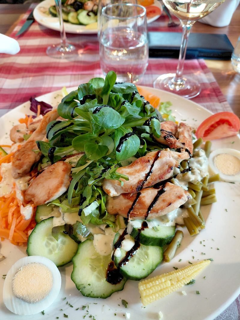Nun erwartete uns im Restaurant Neumühle das Team mit dem Mittagessen Suppe, Salat, Speck Lauchgemüse und Salzkartoffeln. War ein spezielles Menü aber es hatte sehr gemundet. Nach dem Essen war noch eine kurze Wanderung der Emme entlang